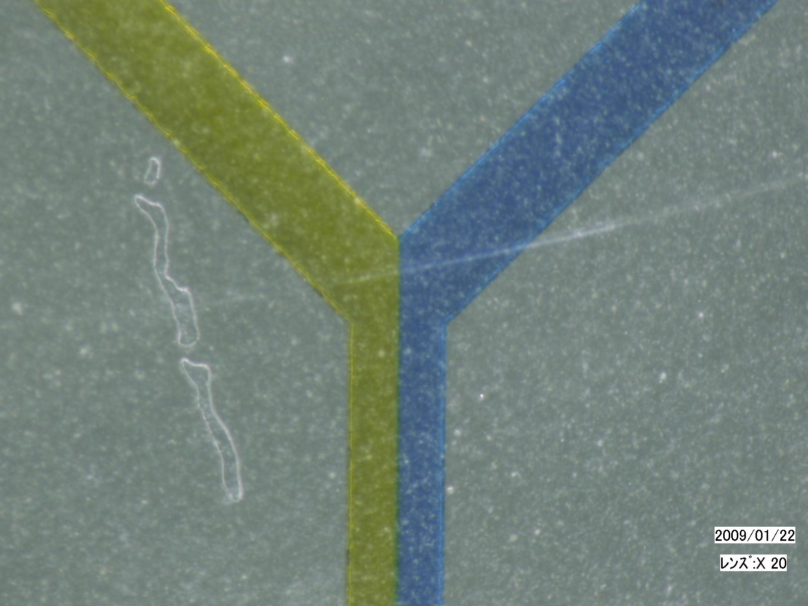 で、とても細い溝に色のついた液体を二種類用意しそれぞれを流してみると、あら不思議!すぐに混じって流れずにそれぞれが並行してながれていきます。(Y型と直線)+型のほうは写真のように流れます。これも不思議。